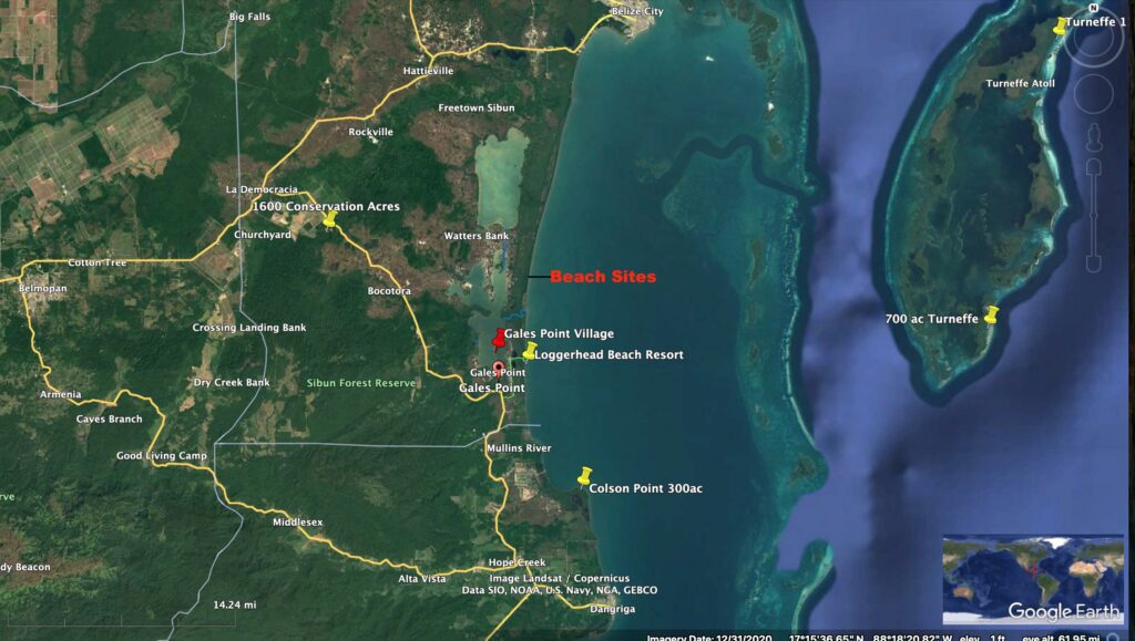 This spectacular beach seems to be a “paradise at the ends of the earth”, however it is merely 17 miles south of Belize City and 9 minutes by helicopter from Belize’s international airport. Currently this location is boat-access only. It is about 1.5 miles north of the mouth of the Manatee Bar River, which is a short, wild-and-scenic river flowing from Belize’s pristine Southern Lagoon. Inside the Southern Lagoon is the historic village of Gales Point, 5 -1/2 miles away, with docks, supplies, licensed guides, and a reliable, educated work force.